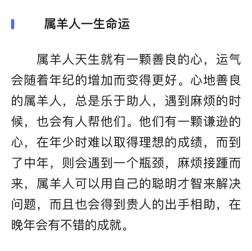 农历四月羊的人生充满了温暖与潜力。他们拥有丰富的情感世界与广阔的职业发展空间,尽管面临一些挑战,但只要善于自我反省和调整,便能在生命的旅程中找到真正的自我,实现梦想。通过对命运的深度探索,四月羊能达到人生的目标。