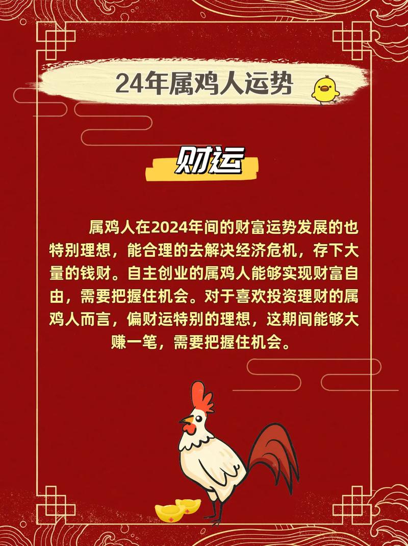 财运方面,属鸡人本月正财稳定,偏财运势旺盛。容易得到意外之财或投资收益。但切忌贪心投机,谨防投资失败。